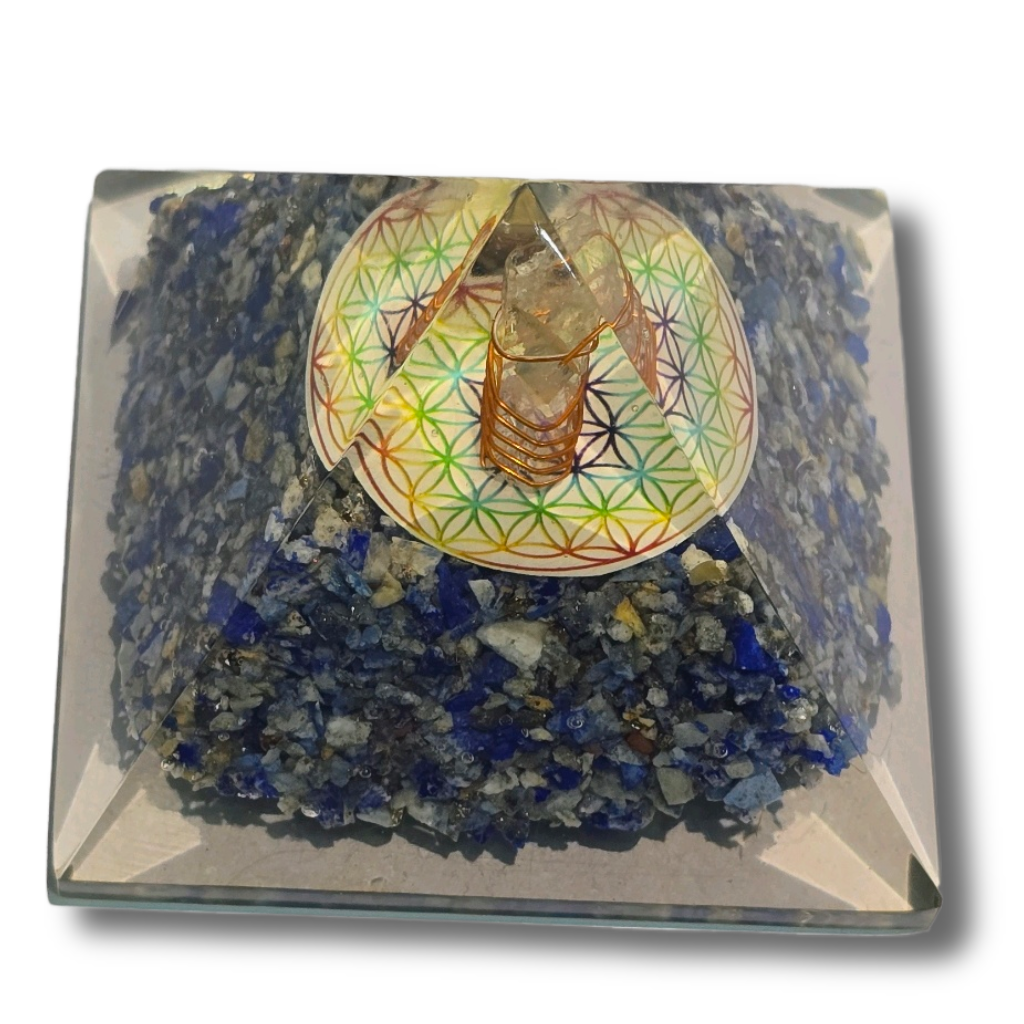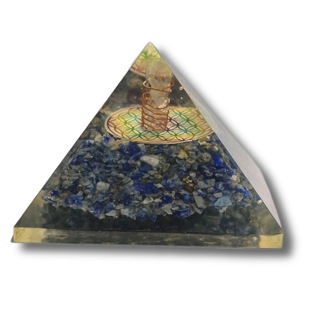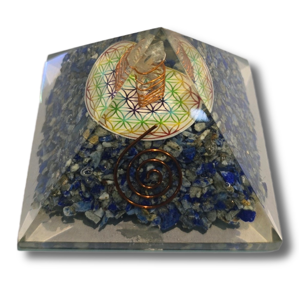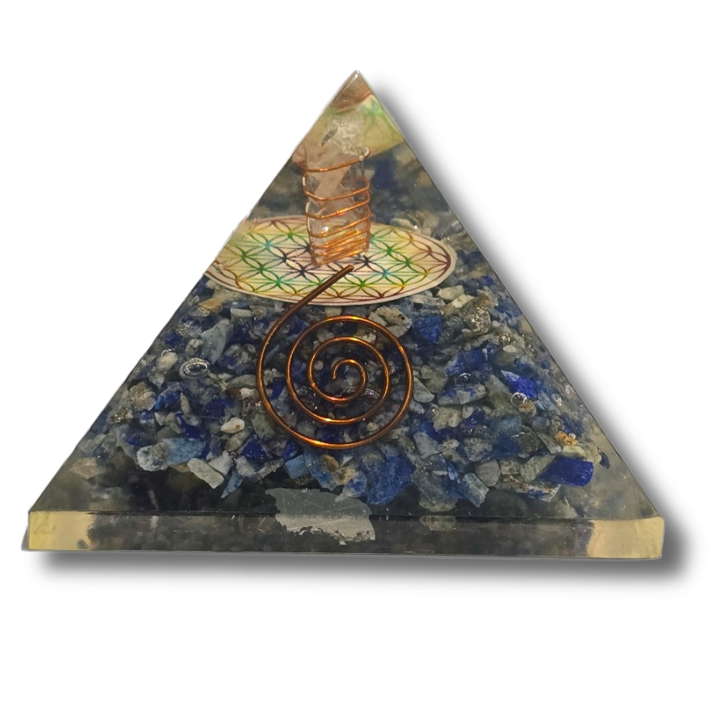 Crafted with Lapis Lazuli, Shri Yantra, resin, and copper coil, this pyramid enhances focus, truth, and spiritual wisdom while attracting abundance, prosperity, and divine blessings.