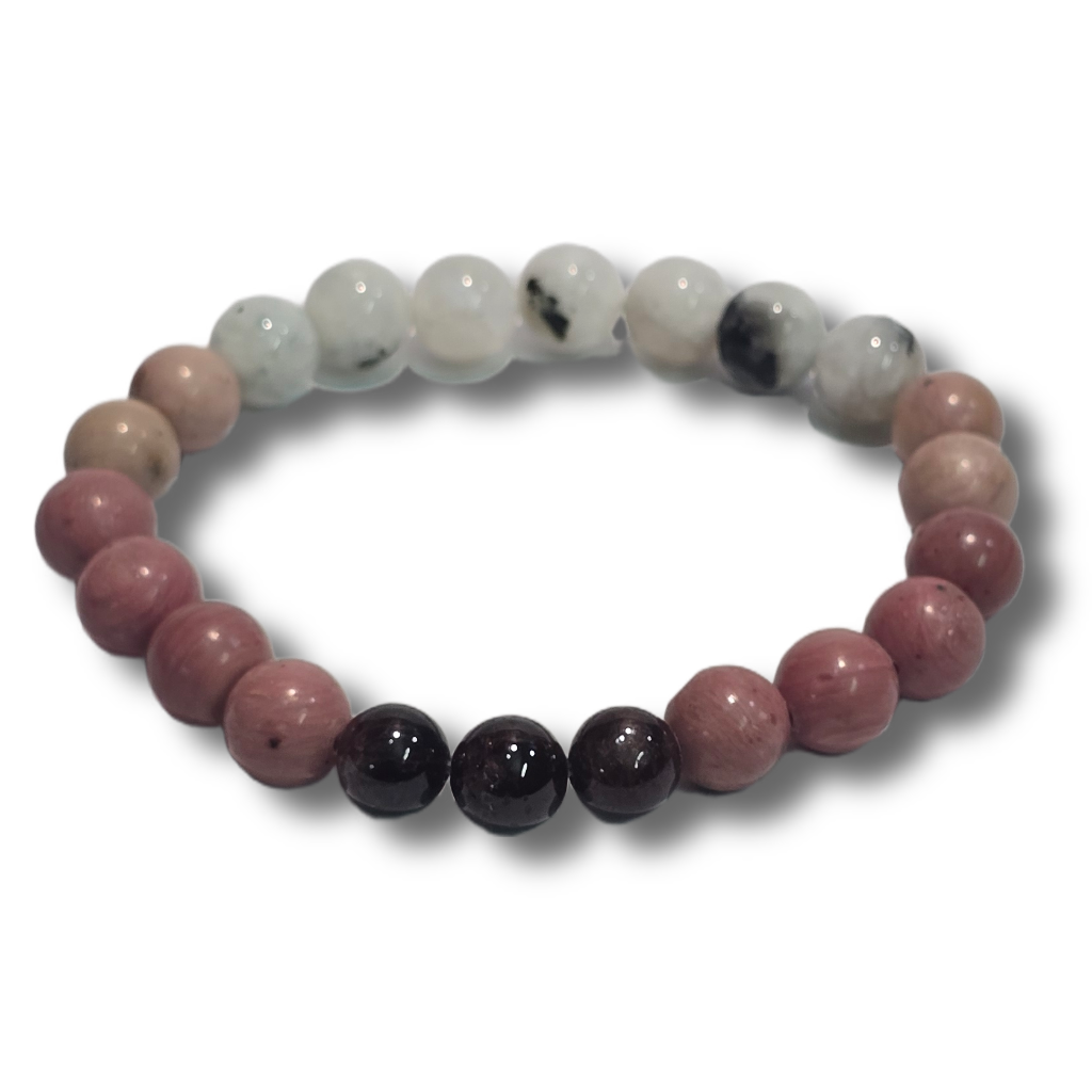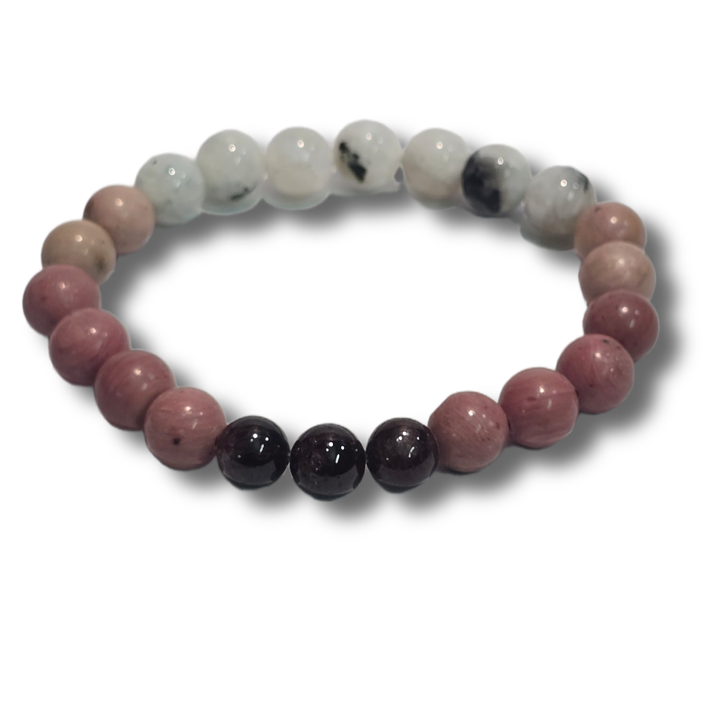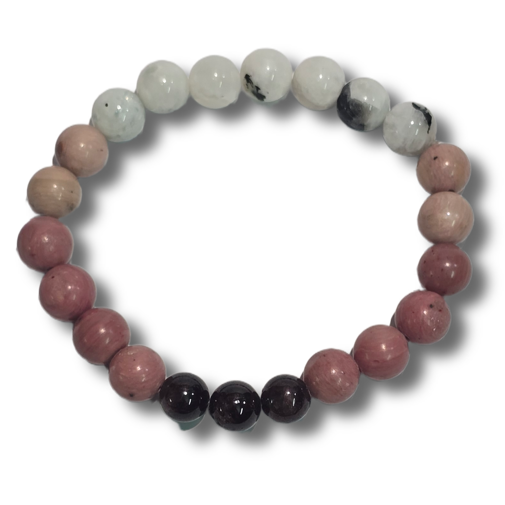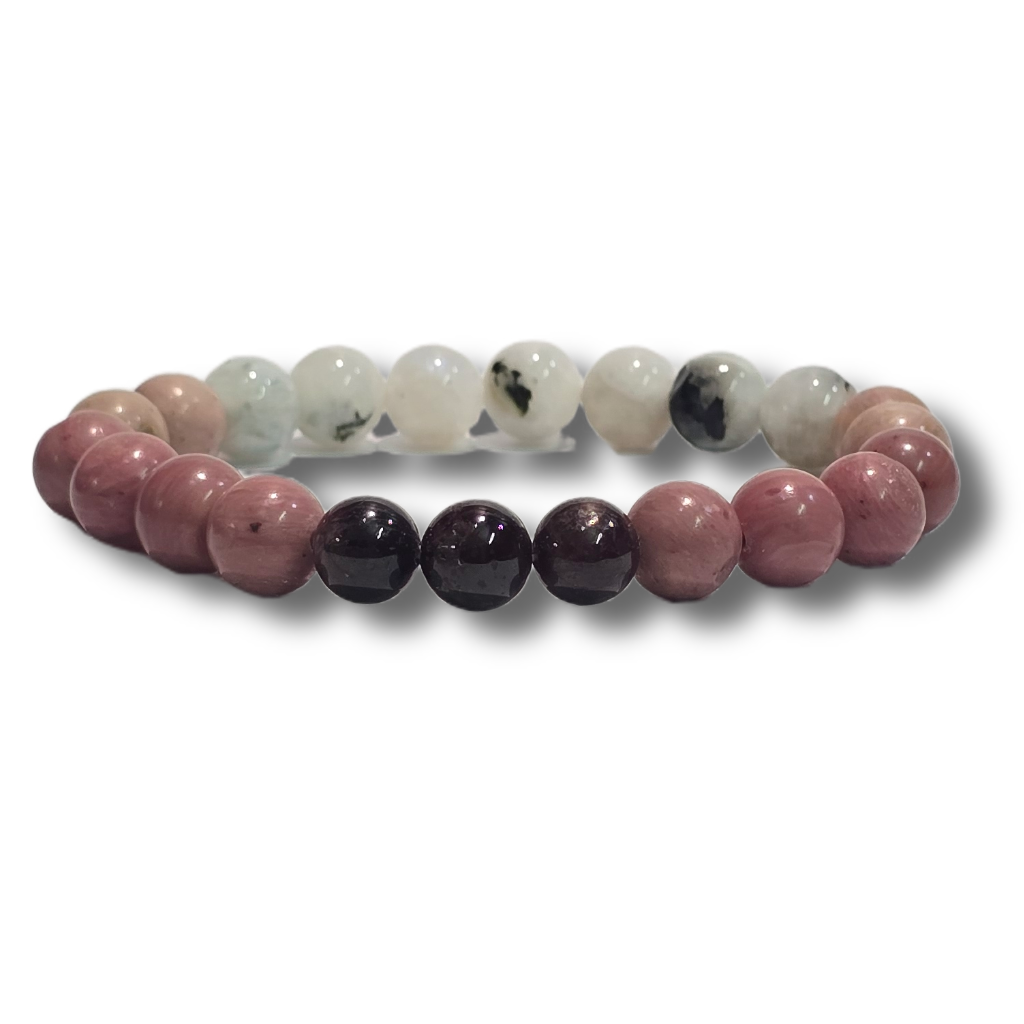 Manifest love and emotional balance with this Love Spell Bracelet, featuring Garnet, Rose Quartz, Rhodonite, Moonstone & Strawberry Quartz—perfect for attraction, healing, and heart chakra alignment.